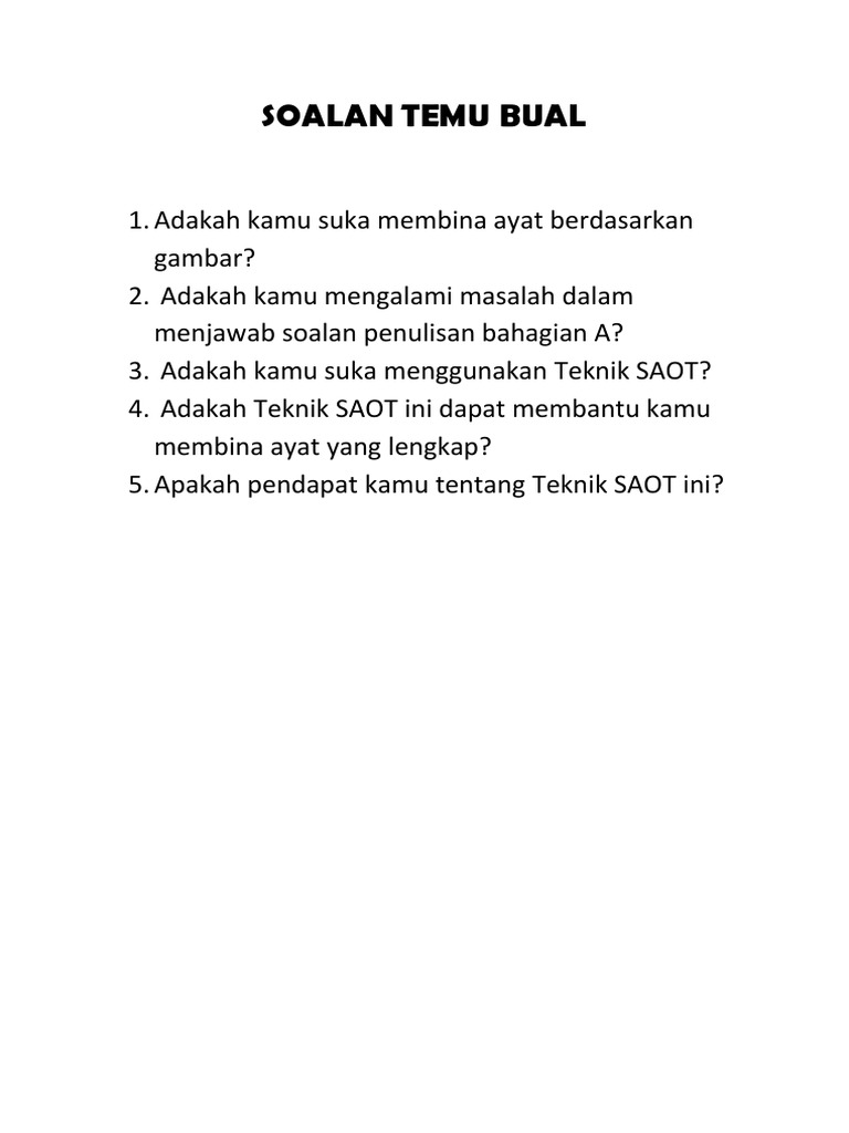 Cara pelaksanaannya ialah dengan melakukan temu bual secara lisan dan jawapan direkod oleh penyelidik secara bertulis melalui rakaman elektronik. Kaedah temu bual kaedah pemerhatian kaedah analisis dokumen 3. Aktiviti perbualan dan soal jawab di mana bentuk dan kandungan soalan-soalan yang ingin ditanya adalah terhad pada sesuatu tajuk atau bidang yang tertentu sahaja.